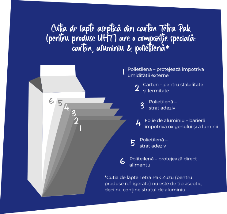 conținutul său carton, plastic (polietilenă) și aluminiu. Stratul fin de polietilenă asigură protejarea de